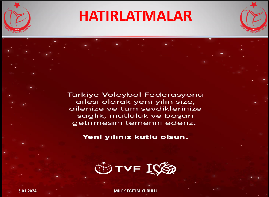 Türkiye Voleybol Federasyonu Merkez Hakem ve Gözlemci Kurulu’nun Hakem ve Gözlemcilere yönelik her yıl gerçekleştirdiği ara seminerin 2023-2024 sezonuna ait olan ilk kısmı online olarak gerçekleştirildi. Seminere MHGK Başkanı Aziz Yener ile MHGK üyeleriyle, hakem ve gözlemci olarak da 126 kişi katıldı. A, A/B Klasman Voleybol hakemleri ile A Klasman Gözlemcilerin yer aldığı seminerde MHGK Başkanı Aziz Yener, sezonun ilk yarısını değerlendirdi. 2023-2024 Sezonunun ilk yarısında oynanan müsabakalardaki pozisyonların videolarının gösterildiği bölümde verilen kararlar üzerinde duruldu. Maçlardan karşılaşılan durumlar ile dilek ve isteklerin konuşulduğu bölümde de MHGK Başkanı Aziz Yener soruları cevapladı. Katılımın zorunlu olduğu seminerin 2. oturumu 04 Ocak 2024 Perşembe günü B klasman hakemleri ile B klasman gözlemcilerinin katılımıyla gerçekleştirilecek.