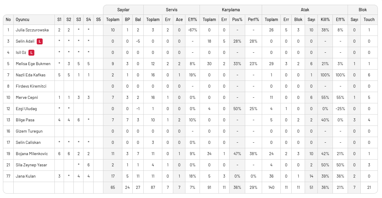 Nilüfer Belediyespor : Merve Çepni, Julia Szczurowska, Jana Kulan, Paşa Bilge , Nazlı Eda Kafkas , Bojana Milenkovic, ( Selin Adalı (L), Işıl Öz (L), Ezgi Uludağ, Selin Çalışkan, Melisa Ege Bükmen, Zeynep Ege Bükmen,