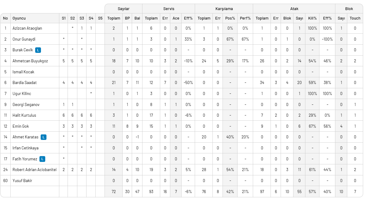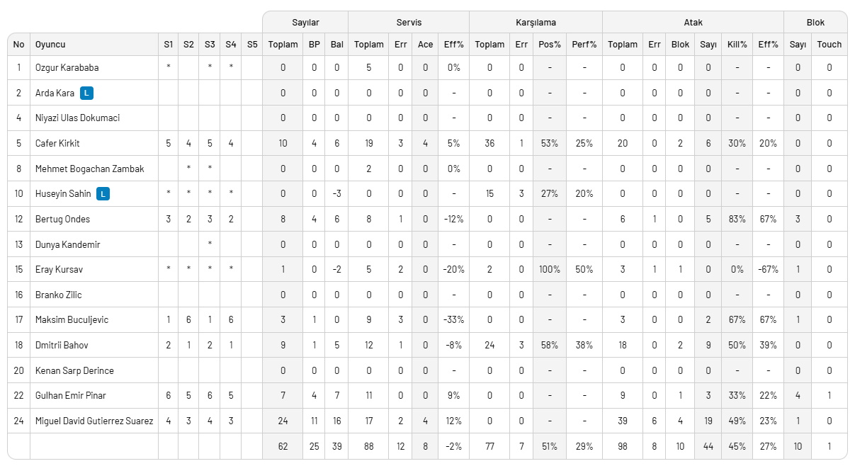 ON HOTELS ALANYA BELEDİYESPOR: Ahmetcan Büyükgöz, Georgi Seganov, Halit Kurtuluş, Emin Gök, Robert Aciobanitei, Bardia Saadat (Ahmet Karataş, Burak Çevik, Onur Günaydı, İrfan Çetinkaya, Azizcan Ataoğlan)