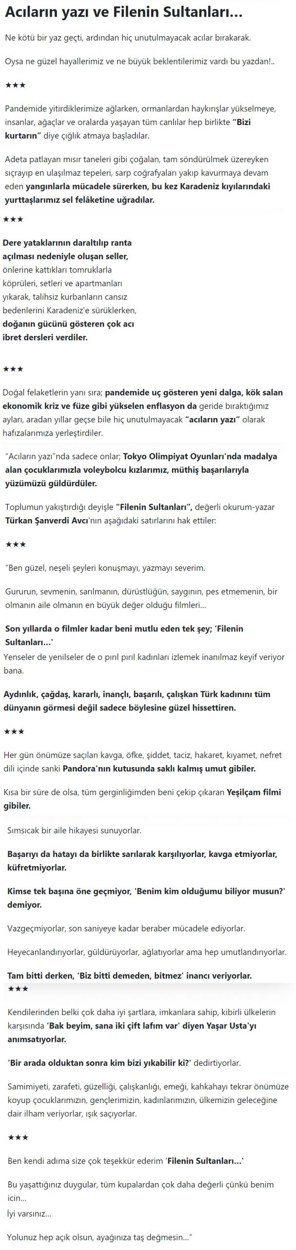 Sözcü Gazetesi yazarlarından, usta gazeteci Uğur Dündar, 27 Ağustos tarihinde gazetesindeki yazısında Filenin Sultanlarından övgü ile bahsetti. İşte bu güzel yazıyı sizlerle paylaşıyoruz.