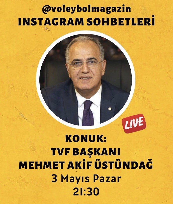 Türkiye Voleybol Federasyonu Mehmet Akif Üstündağ, 3 Mayıs 2020 Pazar günü, saat 21:30’da Voleybolmagazin.Com instagram canlı yayınında Ufuk Soygür’ün sorularını yanıtlayacak. instagram hesabımıza ulaşmak için buraya tıklayınız