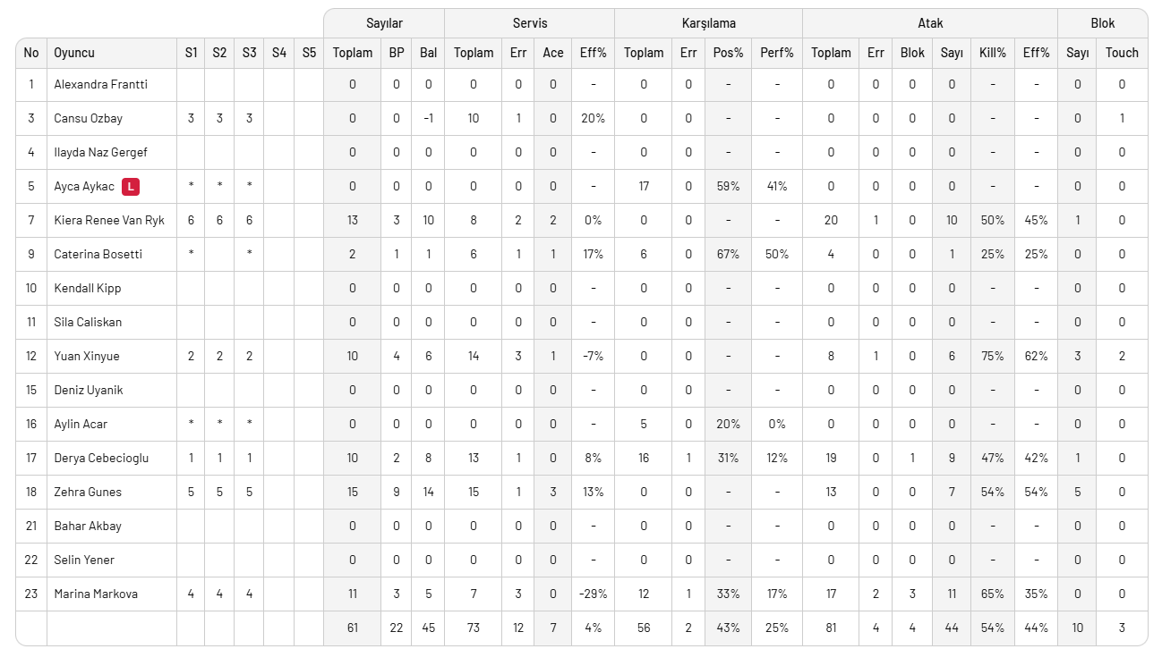 VakıfBank: : Derya Cebecioğlu 10, Yuan Xinyue 10, Cansu Özbay 1, Marina Markova 11, Zehra Güneş 15, Kiera Van Ryk 13, Ayça Aykaç Altıntaş (L)