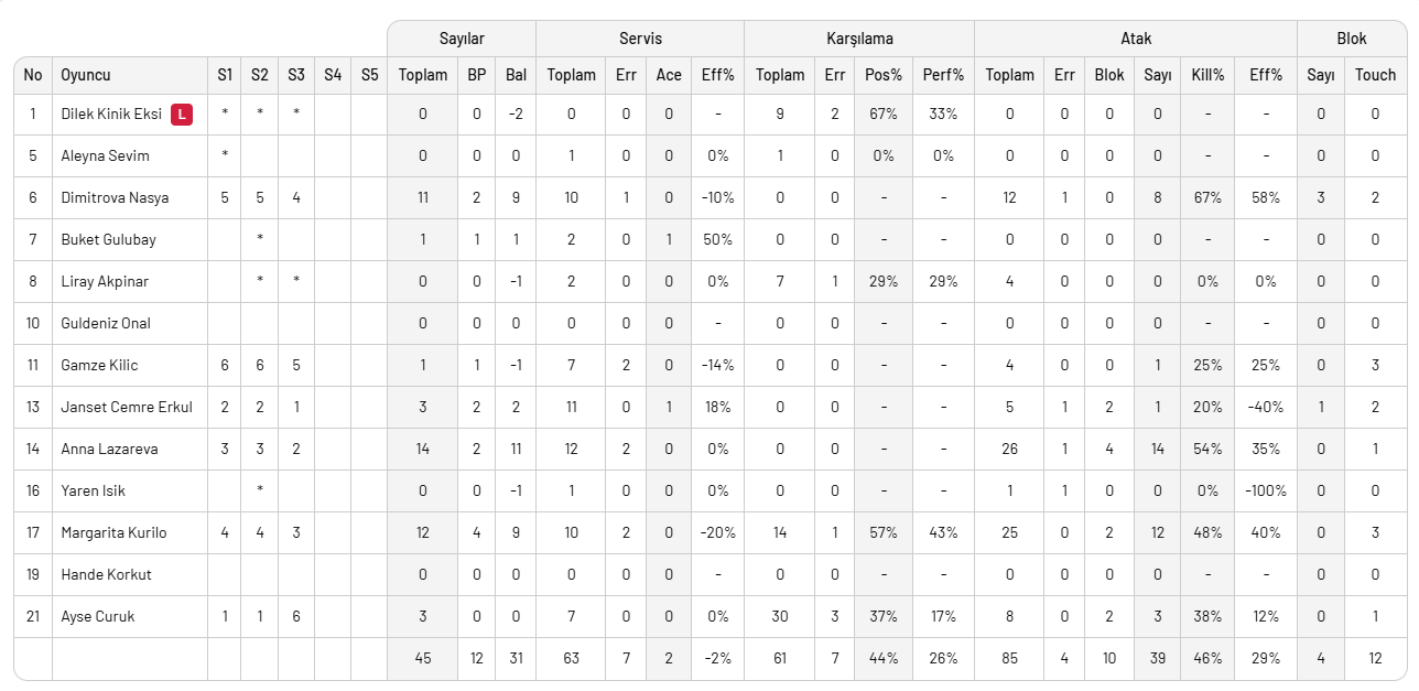 Kuzeyboru: Ayşe Çürük 3, Janset Cemre Erkul 3, Anna Lazareva 14, Margarita Kurilo 12, Nasya Dimitrova 9, Gamze Kılıç 1, Aleyna Sevim (L), Buket Gülübay 1