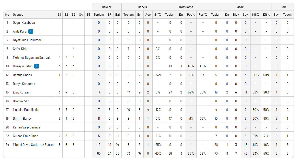 SPOR TOTO: Ulaş Kıyak, Thomas Edgar, Mustafa Koç, Mustafa Cengiz, Salvador Hidalgo, Garret Muagutuia (Beytullah Hatipoğlu, Gökhan Gökgöz, Furkan Dur, Muhammed Kaya, Batuhan Avcı)