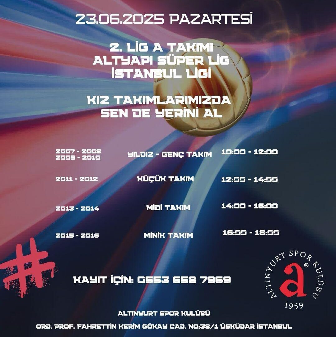 Türk Voleybolunun kilometre taşlarından Altınyurt Spor Kulübü’nün kız takımları seçmeleri 23 Haziran Pazartesi günü yapılacak. Kulübün 2. Lig A Takımı, Altyapı Süper Lig ve İstanbul Ligi Takımları için 2007-2016 Doğumlu voleybolu adayları kayıt için 0553 658 79 69 numaralı telefondan bilgi alabilirler.