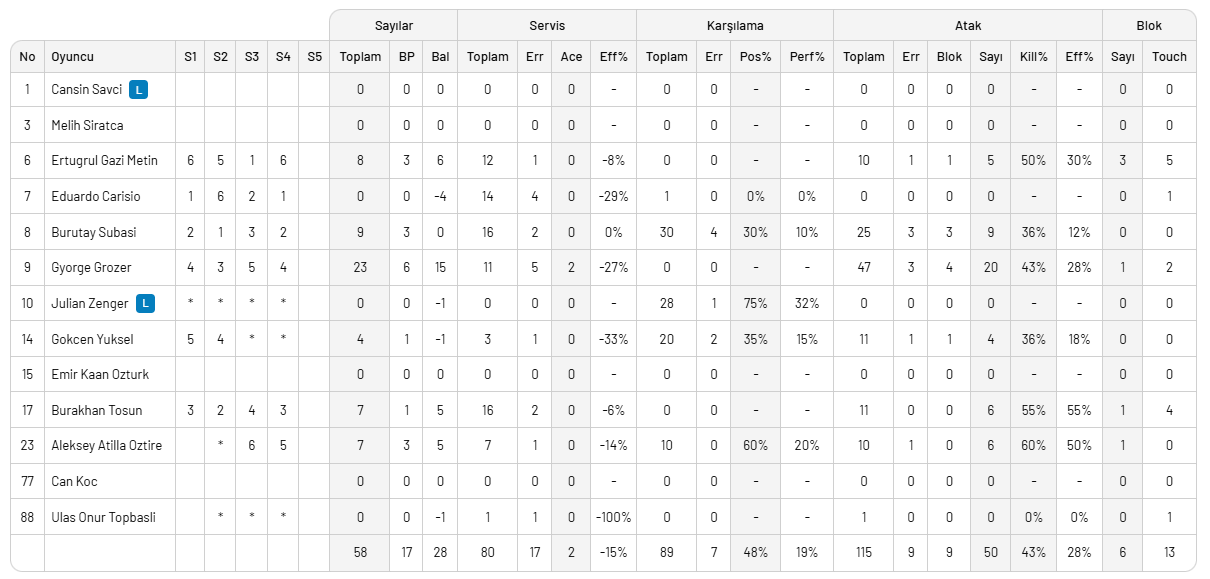ZİRAAT BANKKART: Matthew Anderson, Ter Maat Wouter, Vahit Emre Savaş, Bedirhan Bülbül, Murat Yenipazar, Trevor Clevenot (Berkay Bayraktar, Çağatay Kir, Hilmi Şahin, Samet Güneş)