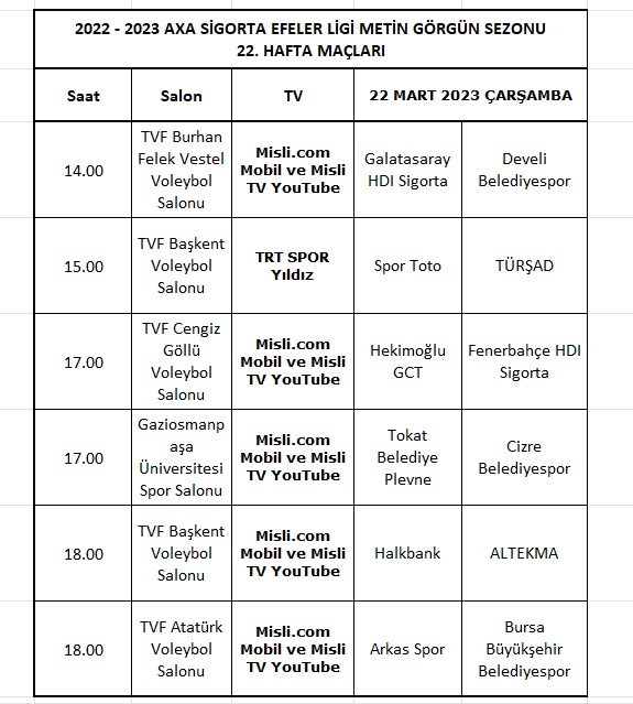 AXA Sigorta Efeler Ligi Metin Görgün Sezonunda 22. hafta karşılaşmaları 22 Mart Çarşamba günü oynanacak. Haftanın maçlarında görev yapacak hakemleri öğrenmek için tıklayınız. Haftanın programı ve geride kalan 21 haftada oluşan puan tablosu şöyle: