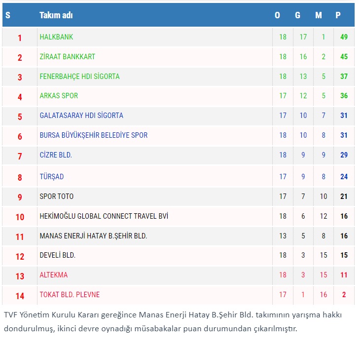 Manas Enerji Hatay B.Şehir Bld. takımının yarışma hakkı dondurulmuş, ikinci devre oynadığı müsabakalar puan durumundan çıkarılmıştır.