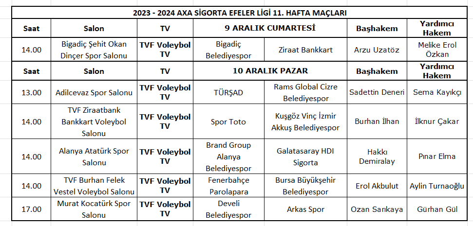 AXA Sigorta Efeler Ligi’nin 1.hafta karşılaşmaları 9-10 Aralık 2023 tarihlerinde oynanacak. TVF Merkez Hakem ve Gözlemci Kurulu Başkanı Aziz Yener, sezonun on birinci haftasında görev yapacak hakemleri açıkladı.