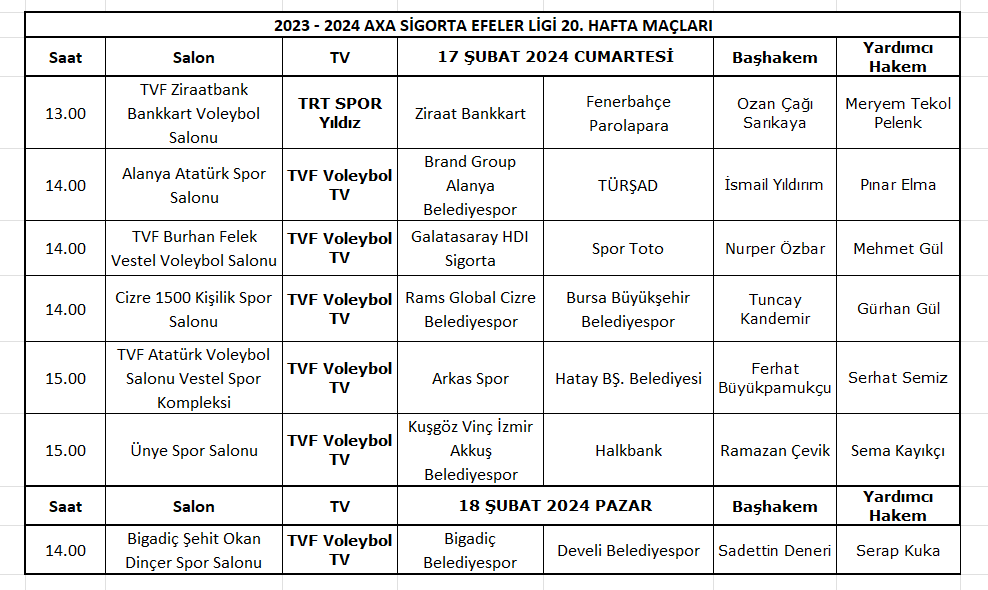 AXA Sigorta Efeler Ligi’nin 20.hafta karşılaşmaları 17-18 Şubat 2024 tarihlerinde oynanacak. TVF Merkez Hakem ve Gözlemci Kurulu Başkanı Aziz Yener, sezonun yirminci haftasında görev yapacak hakemleri açıkladı.