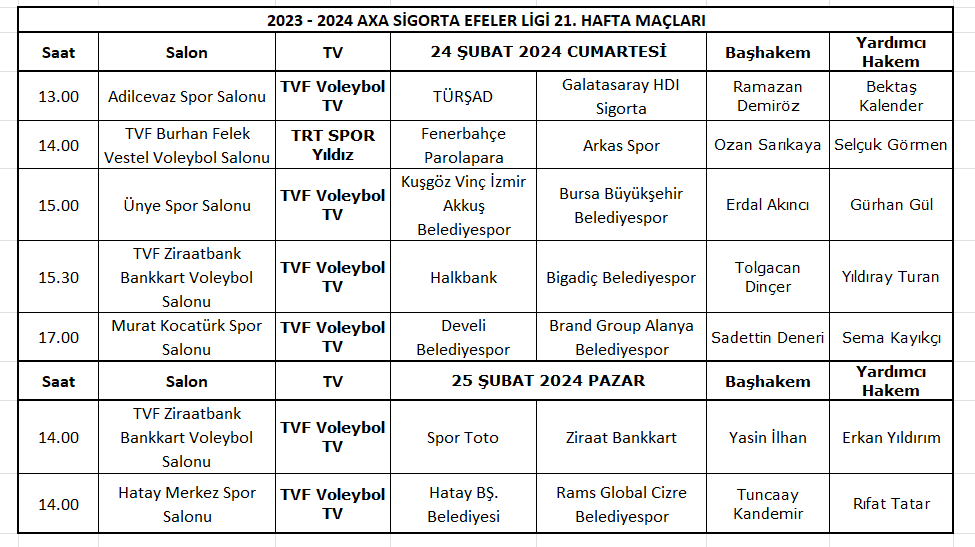 AXA Sigorta Efeler Ligi’nin 21.hafta karşılaşmaları 24-25 Şubat 2024 tarihlerinde oynanacak. TVF Merkez Hakem ve Gözlemci Kurulu Başkanı Aziz Yener, sezonun yirminci haftasında görev yapacak hakemleri açıkladı.