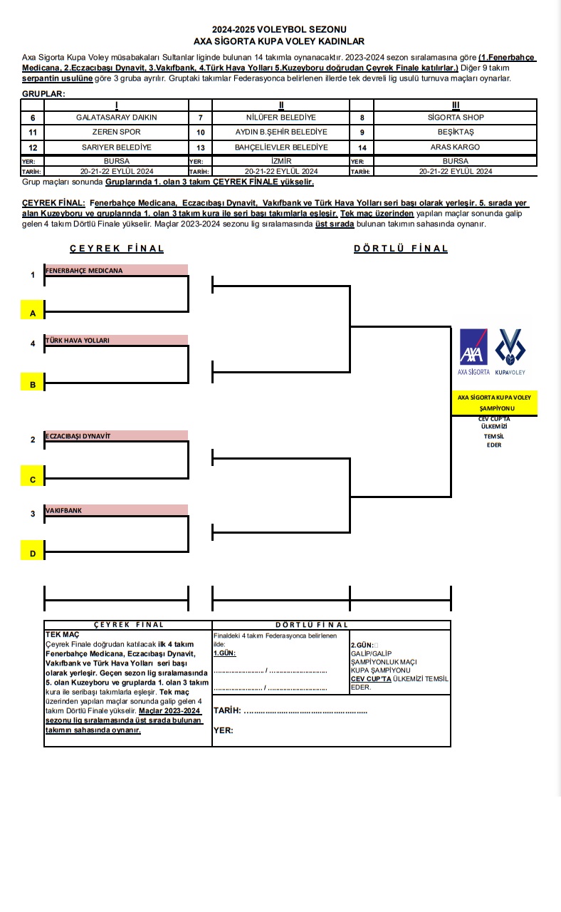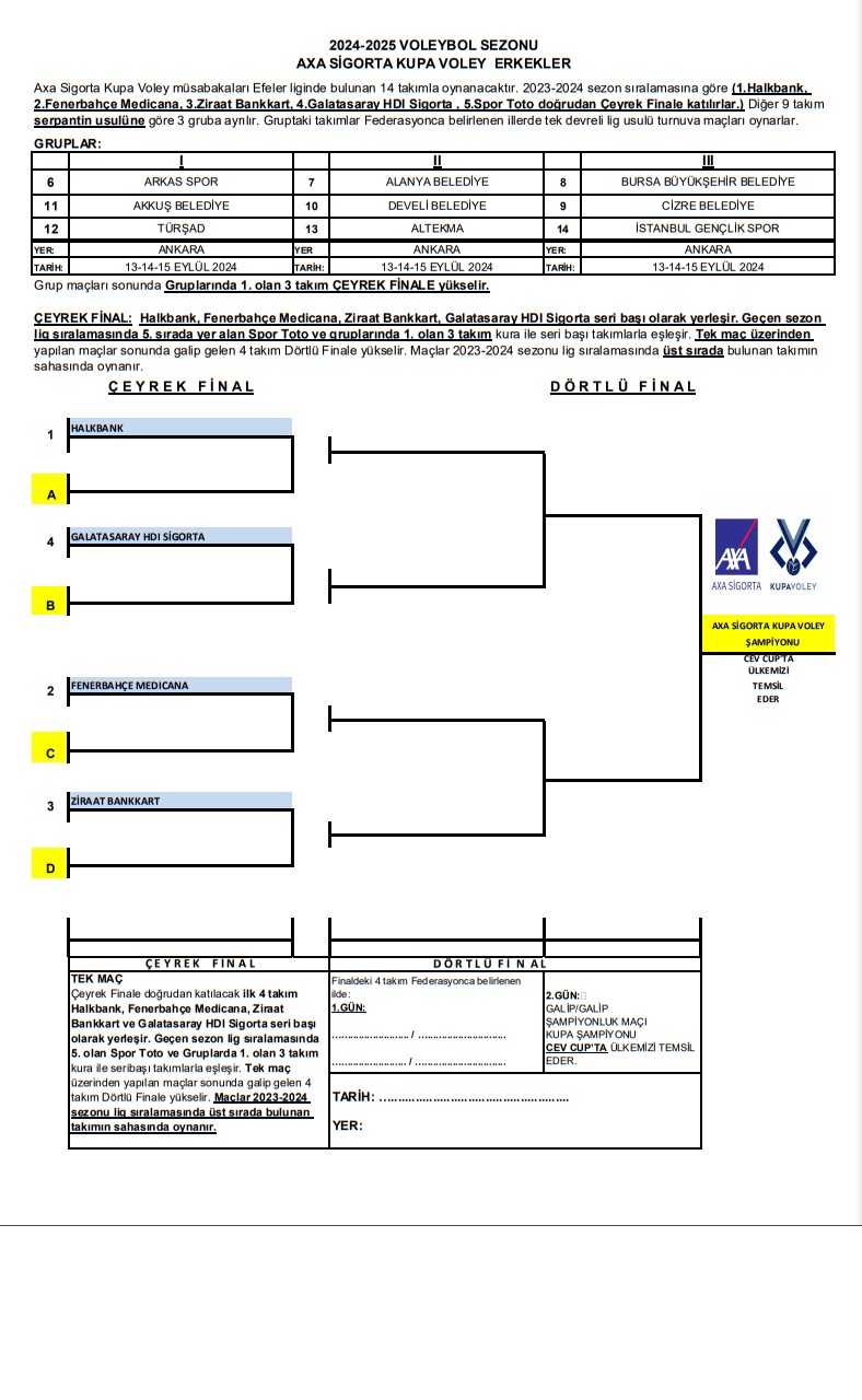 AXA Sigorta Kupa Voley (Erkek-Kadın) 2024-2025 sezonu statüsü belli oldu. Erkekler AXA Sigorta Kupa Voley statüsü için tıklayınız.