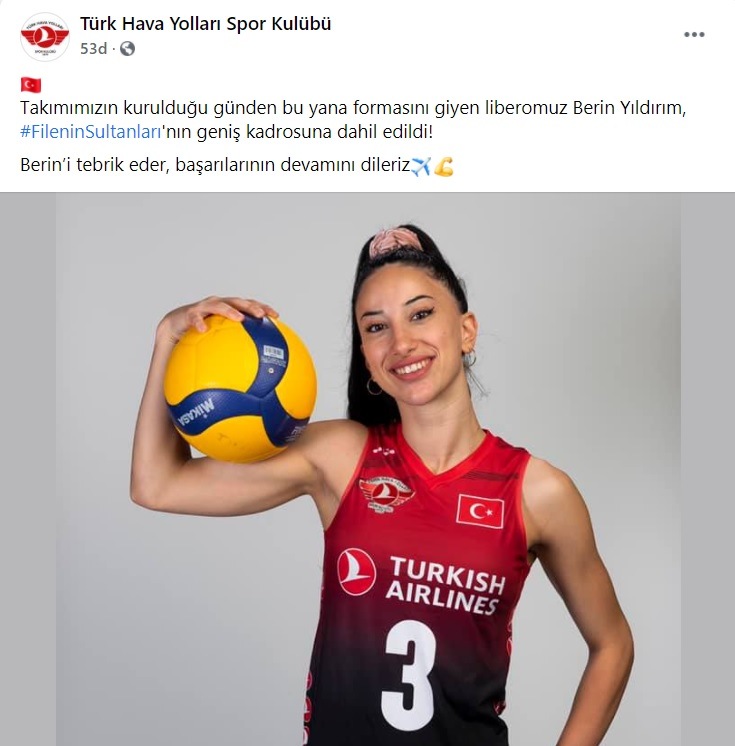 Kulübün kurulduğu günden bu yana formasının hakkını veren başarılı libero Berin Yıldırım, Filenin Sultanları'nın genişletilmiş kadrosuna dahil edildi. Takımın ligi 3. olarak tamamlayarak ülkemizi önümüzdeki sezon Şampiyonlar Ligi'nde temsil etme hakkı elde etmesinde büyük katkısı olan Berin Yıldırım için kulübü tarafından yapılan paylaşım şöyle: