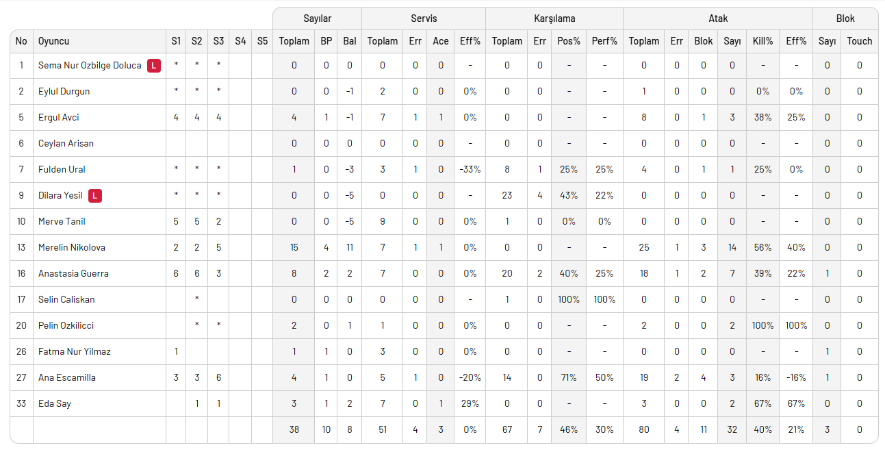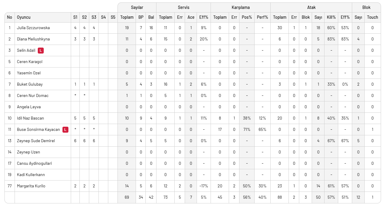 Beşiktaş'ta Julia Szczurowska 19 sayıyla maçın en skorer ismi olurken, Zeynep Sude 5 blok, Meliushkyna 2 servis sayısı ile dikkatleri çekti.