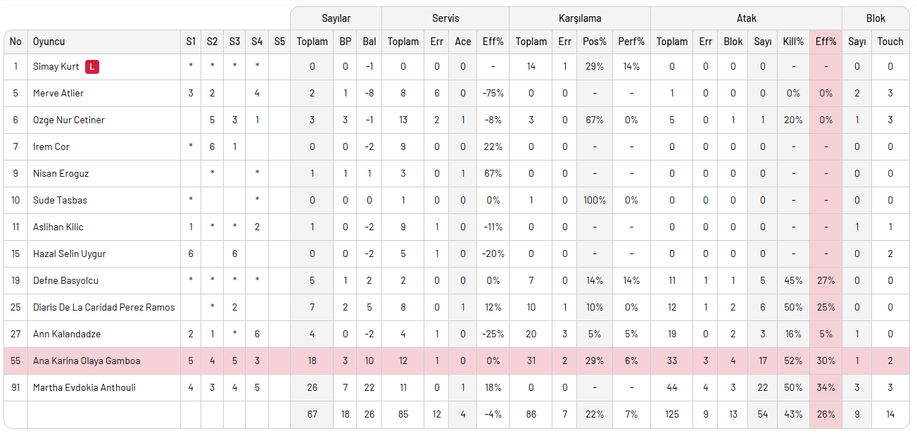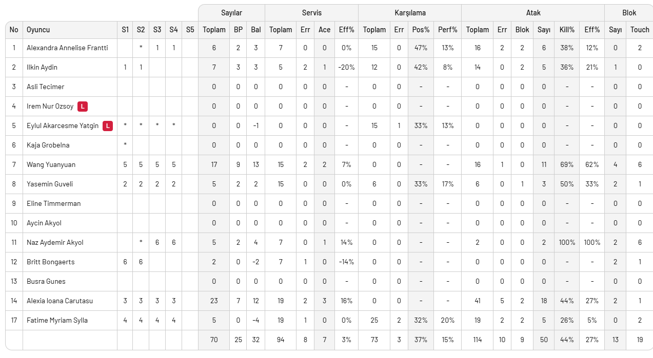 Galatasaray, beşincilik yolunda attığı ilk adımda 13 blok, 50 hücum ve 7 servis sayısı üretti. Rakip hatalarından 25 sayı kazanan sarı-kırmızılı ekipte İlkin 7, Karutasu 23, Yuanyuan 17, Yasemin 5, Sylla 5, Naz 5, Frantti 6, Bongaerts 2 sayı ile galibiyete katkı yaptılar.