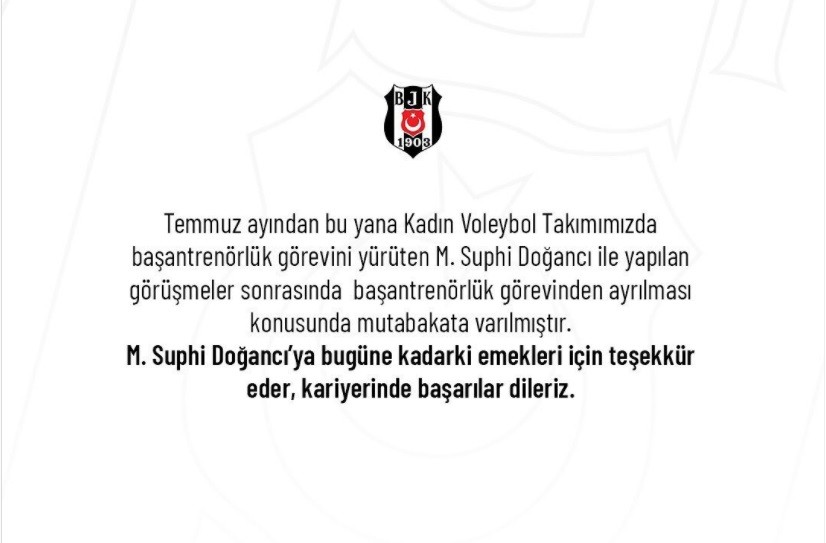 Misli.com sultanlar Ligi Takımlarından Beşiktaş'ta Suphi Doğancı ile yollar ayrıldı. Siyah, beyazlı kulübün sosyal medya üzerinde yaptığı açıklaması şöyle: