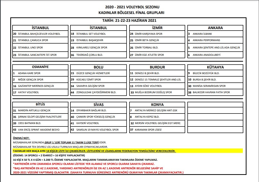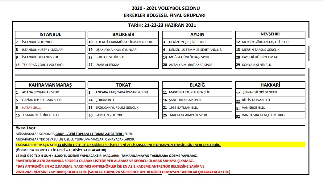 TVF Tarafından düzenlenen Bölgesel Lig'de Final Etabı maçlarının yerleri ve grupları belli oldu.