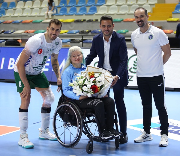 Bu arada karşılaşma sonrasında Bursa Büyükşehir Belediyespor Kulübü Başkanı Gökhan Dinçer, Para Atıcılık Dünya şampiyonu olan Bursa Büyükşehir Belediyesporlu Aysel Özgan’a çiçek takdim ederek başarısından dolayı tebrik etti.