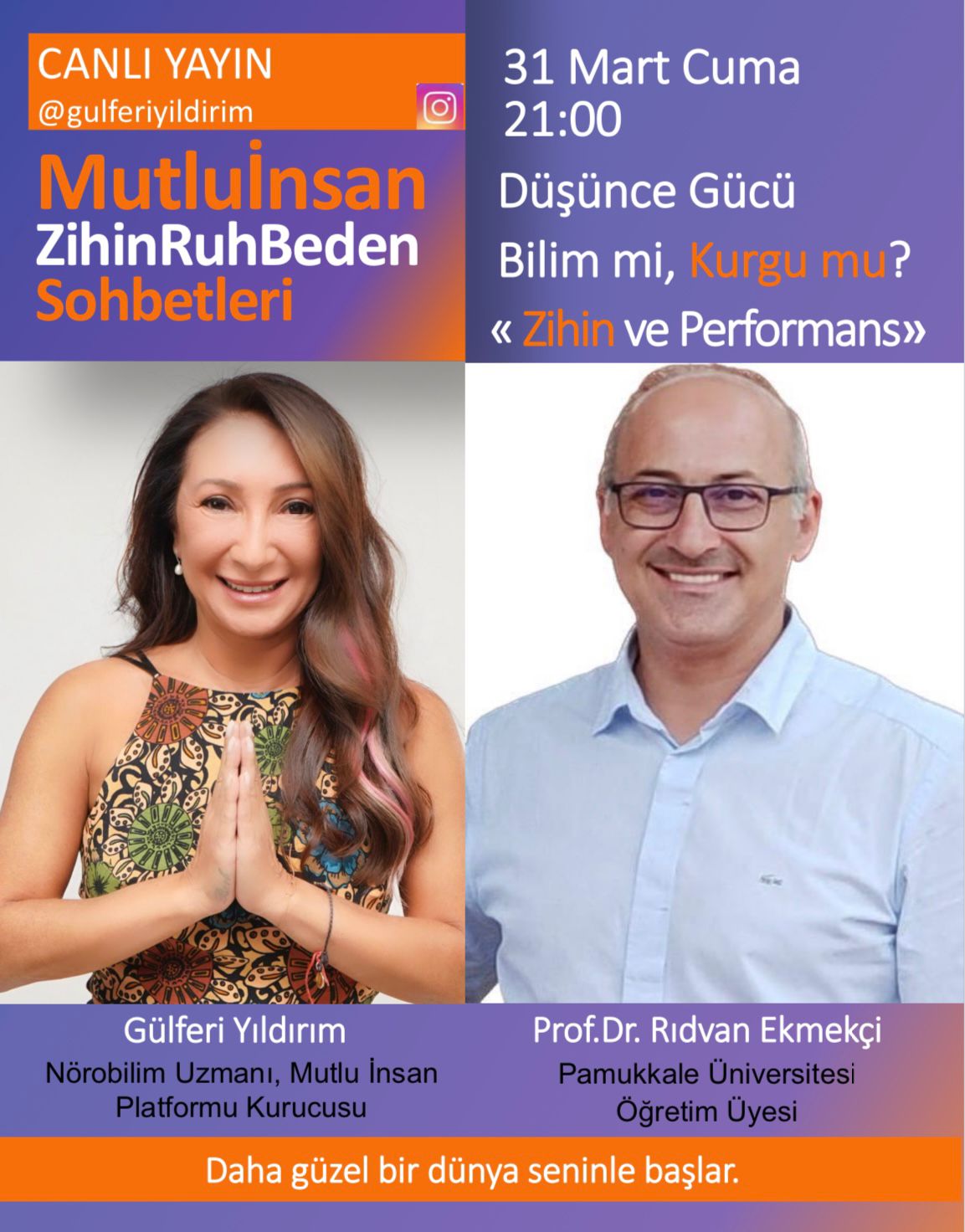 Voleybolumuza sitemizdeki yazıları ve Voleybol Hakemlerine yönelik üç baskı yapan ‘Hakemlikte Zihinsel Hazırlık (Psikolojik Performans) kitabı ile katkı sağlayan; hakemlere ve sporculara yönelik destek çalışmaları ile katma değerli hizmetler sunan Pamukkale Üniversitesi Spor Bilimleri Fakültesi Öğretim Üyesi Porf. Dr. Rıdvan Ekmekçi, Nörobilim Uzmanı Gülferi Yıldırım'ın instagram hesabında 'Mutlu İnsan Zihin Ruh Beden Sohbetleri' canlı yayınına konuk olacak.
