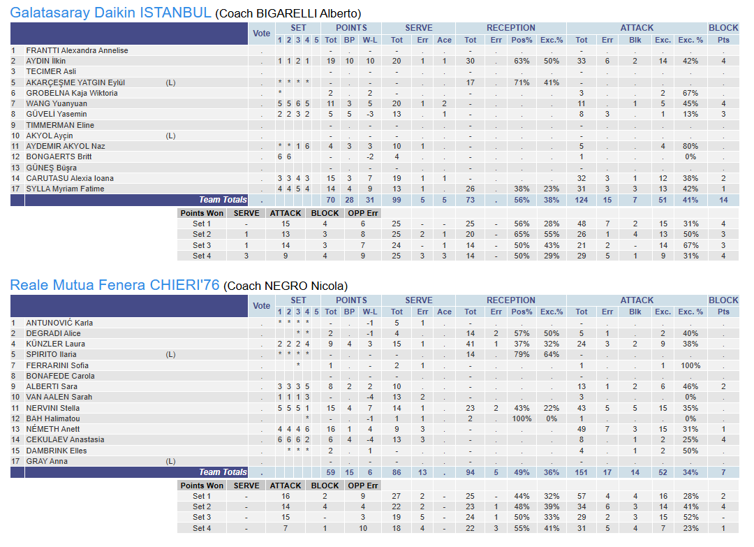 Karşılaşmayı 14 blok, 51 hücum, 5 servis sayısı ile direkt rakip hatasından bulduğu 30 sayı ile kazanan Galatasaray'da kaptan İlkin Aydın 19 sayı ile maçın en skorer ismi olurken, Karutasu 15, Sylla 14, Yunayuan 11 sayı ile çift haneli sayılara ulaştılar. Yasemin Güveli 5, Naz Aydemir Akyol 4, Grobelna 2 sayı ile tarihi şampiyonlukta pay sahibi oldular.