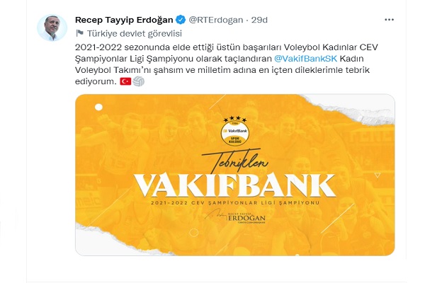 Cumhurbaşkanı Recep Tayyip Erdoğan yayınladığı mesajla 5. kez Şampiyonlar Ligi şampiyonu olan VakıfBank'ı tebrik etti. Mesajda şu ifadeler yer aldı.