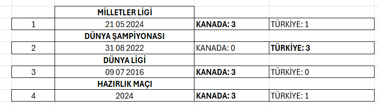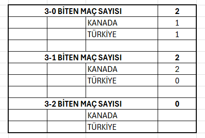 Dünya Şampiyonası’nda ikinci kez karşılaşacağımız rakibimiz ile toplamda 4 kez karşılaşan Milli Takımımız, geride kalan 4 maçın birini kazandı. Kanada ile 2022 yılında Slovenya ve Polonya'nın ortaklaşa düzenlediği Dünya Şampiyonası'nda karşılaşmış ve o maçı 3-1 kaybetmiştik.