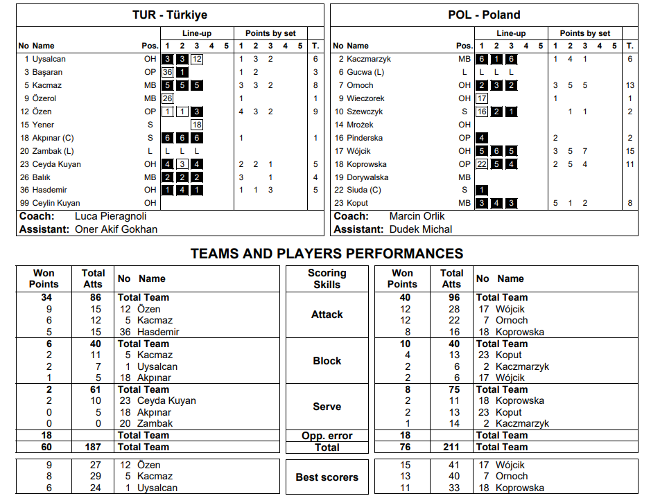 Milli Takımımızda ikinci kez U19 Milli takımımızın formasını giyen pasör çaprazı Minel Nefin Özen 9 sayıyla en skroer oyuncumuz olurken, orta oyuncu Begüm Kaçmaz 8, diğer pasör çaprazı oyuncumuz Aylin Uysalcan 6, smaçörlerimiz Ceyda Kuyan ve Ceren Hasdemir 5'er, Melis Başaran 3, orta oyuncumuz Ezel Balık 4, orta oyuncumuz Güz Özerol ve pasör Irmak Nil Akpınar 1'er sayı kaydettiler.