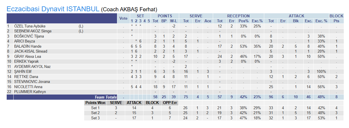 Eczacıbaşı Dynavit: Jack-Kısal, Elif, Gray, Rettke, Nicoletti, Hande, Aybüke (L), Boskovic, Naz, Yaprak, Beyza