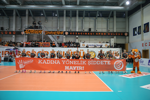 Eczcıbaşı Dynavit sahaya 'Kadına Yönelik Şiddete Hayır' yazılı pankartla çıktı.