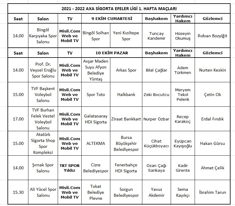 AXA Sigorta Efeler Ligi'nde 2021-2022 Sezonu, 9 Ekim Cumartesi günü oynanacak maçlarla başlayacak. MHGK Başkanı Aziz Yener, yaptığı yazılı açıklama ile AXA Sigorta Efeler Ligi'nin ilk haftasında görev yapacak hakem ve gözlemcileri açıkladı. İşte sezonun ilk haftasında görev yapacak hakem ve gözlemciler: