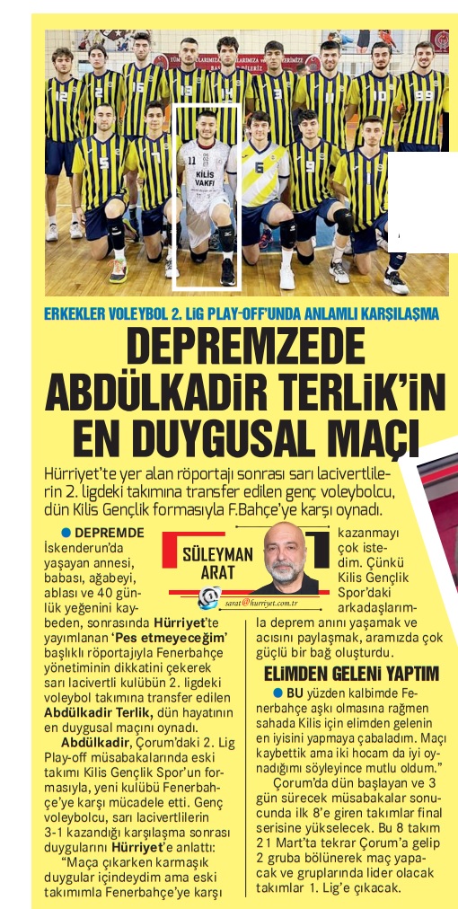 Hürriyet’te yer alan röportajı sonrası sarı lacivertlilerin 2. ligdeki takımına transfer edilen genç voleybolcu, dün Kilis Gençlik formasıyla Fenerbahçe’ye karşı oynadı. Depremde İskenderun’da yaşayan annesi, babası, ağabeyi, ablası ve 40 günlük yeğenini kaybeden, sonrasında Hürriyet’te yayımlanan ‘Pes etmeyeceğim’ başlıklı röportajıyla Fenerbahçe yönetiminin dikkatini çekerek sarı lacivertli kulübün 2. ligdeki Voleybol takımına transfer edilen Abdülkadir Terlik, dün hayatının en duygusal maçını oynadı. Abdülkadir, Çorum’daki 2. Lig Play-off müsabakalarında eski takımı Kilis Gençlik Spor’un formasıyla, yeni kulübü Fenerbahçe’ye karşı mücadele etti. Genç voleybolcu, sarı lacivertlilerin 3-1 kazandığı karşılaşma sonrası duygularını Hürriyet’e anlattı: “Maça çıkarken karmaşık duygular içindeydim ama eski takımımla Fenerbahçe’ye karşı kazanmayı çok istedim. Çünkü Kilis Gençlik Spor’daki arkadaşlarımla Deprem anını yaşamak ve acısını paylaşmak, aramızda çok güçlü bir bağ oluşturdu.Elimden Geleni Yaptım Bu yüzden kalbimde Fenerbahçe aşkı olmasına rağmen sahada Kilis için elimden gelenin en iyisini yapmaya çabaladım. Maçı kaybettik ama iki hocam da iyi oynadığımı söyleyince mutlu oldum.” Fenerbahçe Başantrenörü Ali Yılmaz ise, “Bu sezon 14 maçtır kaybetmeyen takım ünvanlıyla çıktığımız bu maçı da kazanıp serimizi 15 yaptık. Oyuncumuz Arda Şenay18 sayı kazandı. Şimdi hedefimiz 1. Lige yükselmek. Abdülkadir de Kilis formasıyla gerçekten çok iyi oynadı, geleceği çok parlak bir pasör ve servis karşılamaların hepsinde başarılı oldu” dedi. Çorum’da dün başlayan ve 3 gün sürecek müsabakalar sonucunda ilk 8’e giren takımlar final serisine yükselecek. Bu 8 takım 21 Mart’ta tekrar Çorum’a gelip 2 gruba bölünerek maç yapacak ve gruplarında lider olacak takımlar 1. Lig’e çıkacak. Haber: Süleyman Arat - Hürriyet