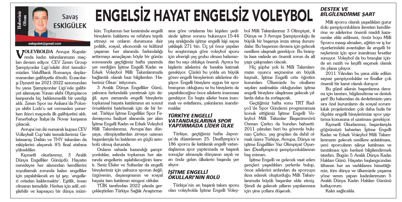 Engelsiz Hayat, Engelsiz VoleybolSavaş Eskigülek, Aydınlık Gazetesi'ndeki Haberiniz Olsun isimli köşesinde 3 Aralık Engelliler Günü sebebiyle kadın ve erkek İşitme Engelli Voleybol Takımlarımızın başarılarından bahsetti.