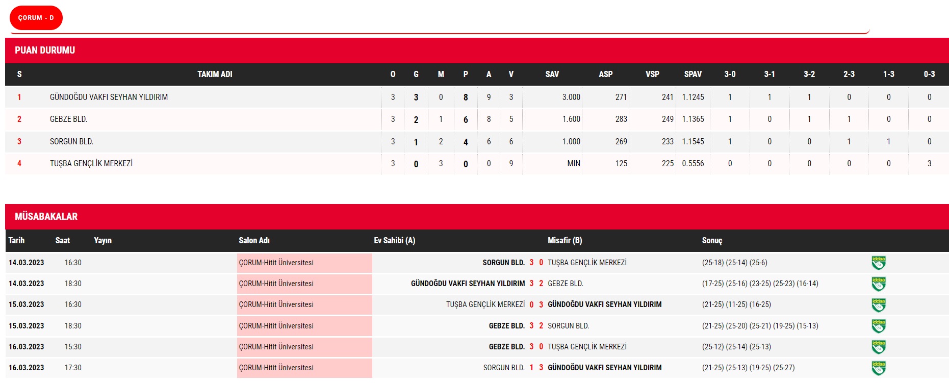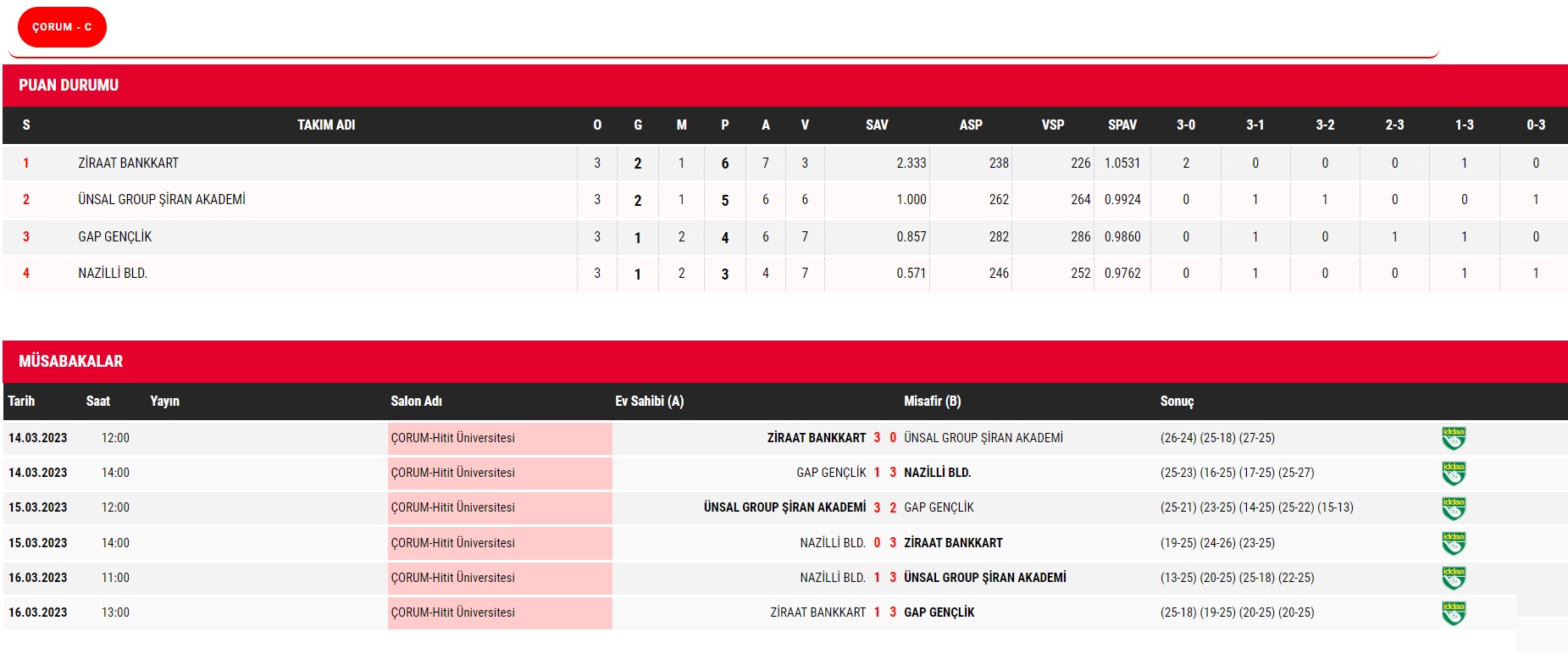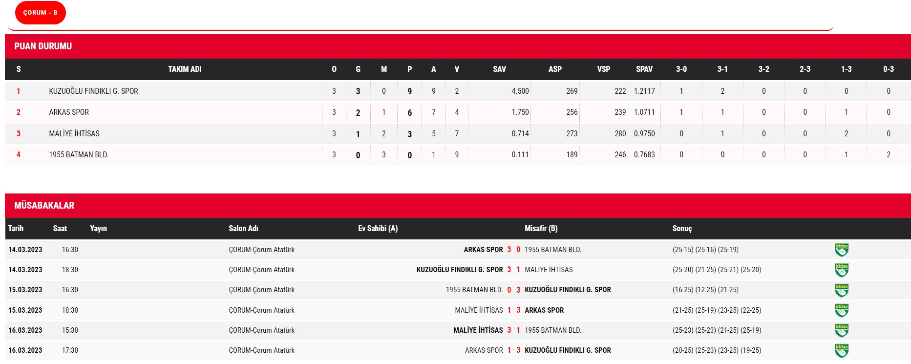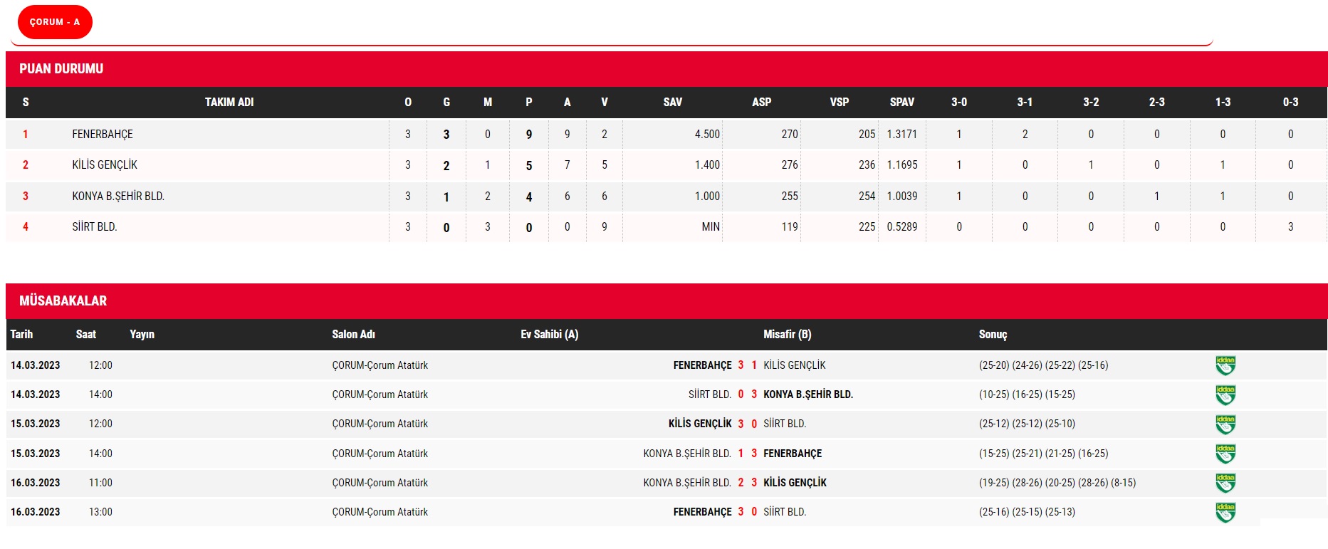 Çorum’un ev sahipliği yaptığı TVF Erkekler 2. Ligi yarı final etabında 3. ve son gün karşılaşmaları 16 Mart Perşembe günü 8 grupta oynanan maçlarla tamamlandı. Üç gün sonunda A Grubunda Fenerbahçe, Kilis Gençlik Spor, B Grubunda Kuzuoğlu Fındıklı Gençlik Spor, Arkas Spor, C Grubunda Ziraat Bankkart, Ünsal Group Şiran Akademi, D grubunda Adana Gündoğdu Vakfı ve Gebze Belediyespor takımları Final Etabına yükseldiler. Final Etabı maçları 21-22-23 Mart 2023 tarihlerinde Çorum Atatürk Spor Salonu’nda yapılacak. Yarı finalde 4 gruptan ilk iki takımın yükseldiği final etabında toplam 8 takım tek devreli lig usulü oynayacaklar. Turnuva maçları sonunda her iki grubun 1 ve 2.’leri toplam 4 takım 1. Erkekler Voleybol Ligine terfi edecek. Oynanan maçlarda alınan sonuçlar ile puan tablosu şöyle: