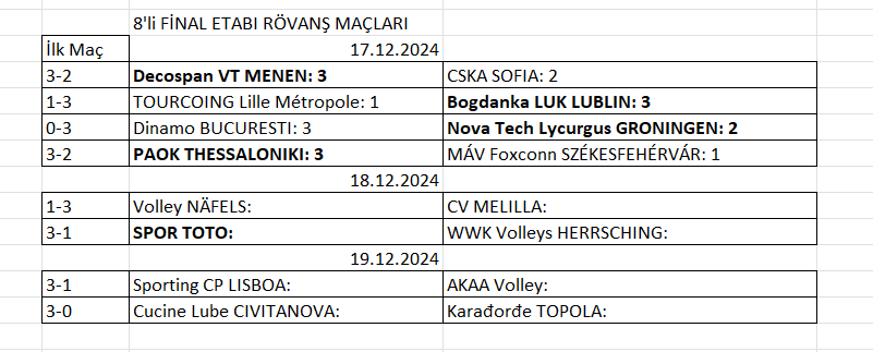 Ülkemizi Spor Toto Spor Kulübü’nün temsil ettiği 2025 CEV Challenge Cup’ta 8’li final etabı ikinci maçları başladı. Temsilcimiz ilk etaptaki ilk maçta Almanya deplasmanında WWK Volleys HERRSCHING’i 3-1 yenmişti. Temsilcimize tur atlaması için alacağı her türlü galibiyet veya 2 set yeterli olacak. 2025 CEV Challenge Cup’ta 8’li final etabında oynanan ikinci maçlarda alınan sonuçlar ve kalan maçlara ait program şöyle: