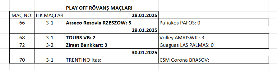 Ülkemizi Ziraat Bankkart’ın temsil ettiği 2025 CEV Cup’ta Play Off etabı ikinci maçları devam ediyor. Temsilcimiz etapta ilk maçta 3-2 yendiği rakibi İspanyol Guaguas LAS PALMAS'ı Ankara'da 3-0 yenerek adını çeyrek finale yazdırdı. 2025 CEV Cup’ta Play Off etabında oynanan ikinci maçlarda alınan sonuçlar ile kalan maça ait program şöyle: