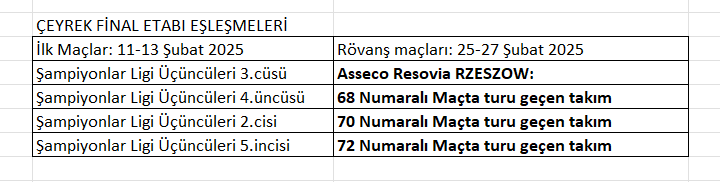 İlk maçlarının 11-13 Şubat, rövanş maçlarının 25-27 Şubat tarihlerinde oynanacağı çeyrek final etabındaki eşleşmeler şöyle olacak: