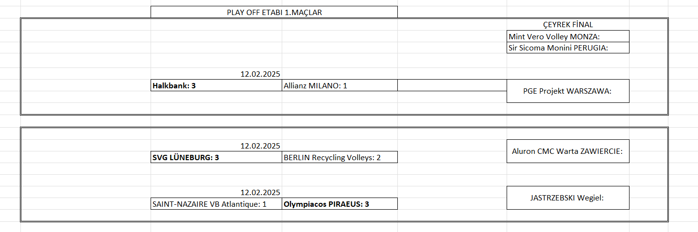 Erkekler 2025 CEV Şampiyonlar Ligi Play Off ilk maçları oynandı. Temsilcimiz Halkbank Play Off etabındaki ilk maçını Ankara’da 12 Şubat Çarşamba günü İtalya’nın Allianz Milano takımını konuk etti e sahadan 3-1'lik galibiyetle ayrıldı. Bu maçın rövanşı 25 Şubat Salı günü Milano’da oynanacak. Erkekler Şampiyonlar Ligi Play Off ilk maçlarında alınan sonuçlar şöyle: