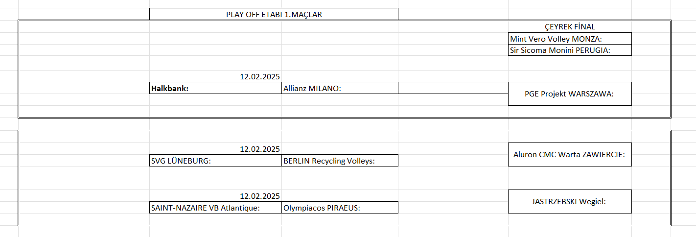 Grup maçlarının tamamlanmasının ardından Erkekler 2025 CEV Şampiyonlar Ligi Play Off maçları başlıyor. Temsilcimiz Halkbank Play Off etabındaki ilk maçını Ankara'da 12 Şubat Çarşamba günü İtalya'nın Allianz Milano takımı ile oynayacak. Bu maçın rövanşı 25 Şubat Salı günü Milano'da oynanacak. Erkekler Şampiyonlar Ligi Play Off maç programı şöyle: