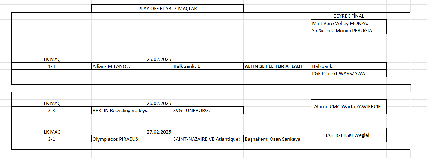 Erkekler 2025 CEV Şampiyonlar Ligi Play Off rövanş maçları başladı. Gecenin tek maçında temsilcimiz Halkbank, ilk maçta Ankara’da 3-1 yendiği rakibi Allianz Milano'ya İtalya’da ayı skorla yenildi. Turu geçen takımın belirleneceği Altın Seti 15-13 kazanan Halkbank adını çeyrek finale yazdırdı. Temsilcimiz çeyrek finalde Polonya'nın PGE Projekt WARSZAWA takımı ile eşleşti. Milano takımı ile oynayacak. İlk maç Ankara'da oynanacak. Erkekler Şampiyonlar Ligi Play Off rövanş maçları programı şöyle: