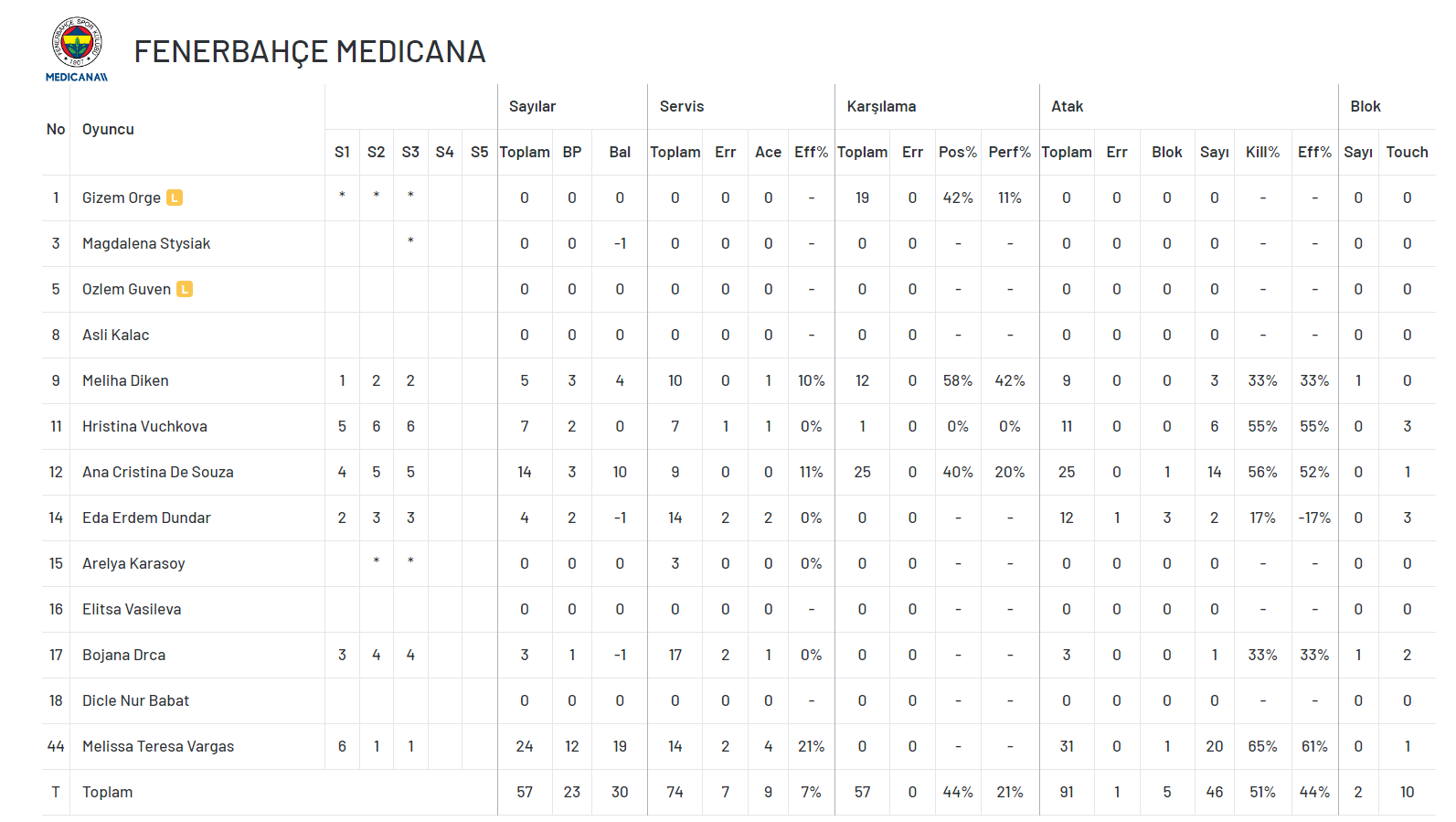 Fenerbahçe Medicana: Meliha, Eda, Drca, De Souza, Vuchkova, Vargas, Gizem (L)