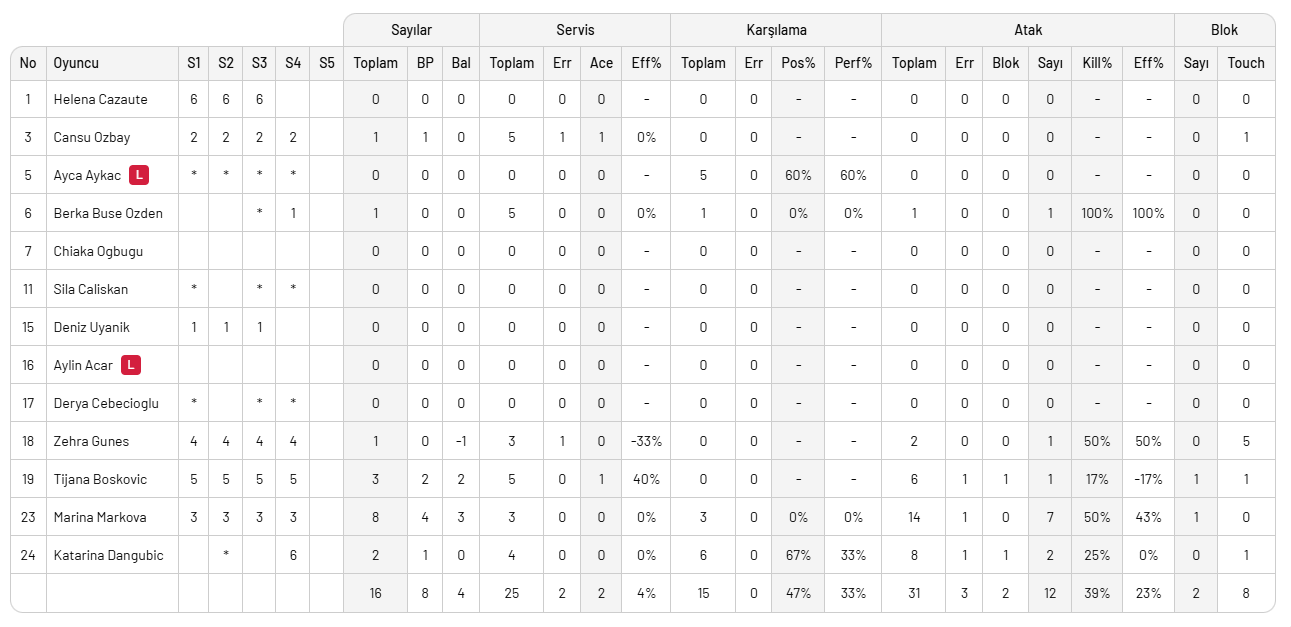 İkinci sette Arina Fedorovtseva ve Arelya Karasoy’un servis turuyla etkili olan sarı - lacivertliler, 25 - 19 ile skoru eşitledi. Üçüncü set, Eda Erdem Dündar ve Vargas’ın bloklardaki üstünlüğüyle 25 - 22 Fenerbahçe lehine sonuçlandı.