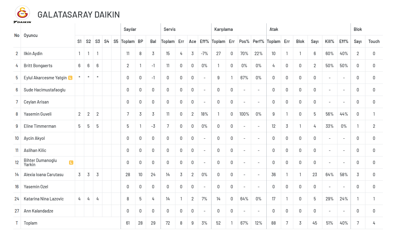 Galatasaray Daikin: İlkin, Yasemin, Aleksiya, Dangubiç, Timmerman, Bongaerts, Eylül (L),