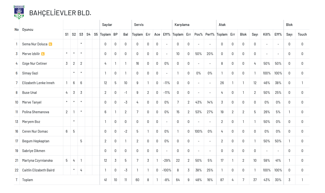 Bahçelievler Belediyespor: Inneh, Shemanova, Özge Nur, Czyrnianska, Ceren, Buse, Merve (L), Sema Nur (L), Merve Tanyel, Simay, Baird, Meryem Boz, Begüm,