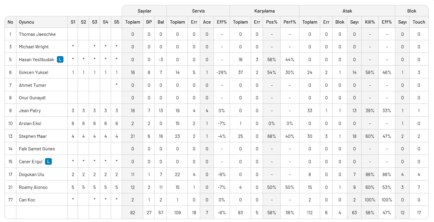 Yaklaşık iki buçuk saat süren maçta 63 hücum, 12 blok ve 7 servis sayısı ile maçı kazanan Galatasaray'da Kanadalı smaçör Stephen Maar 18 hücum, 2 blok ve 1 servis sayısı toplam 21 sayı kaydetti. Fransız pasör çaprazı Jean Patry 18, Gökcen Yüksel 16, Roamy Alonso 12, Doğukan 11 sayı ile galibiyete katkı yaptılar. Doğukan, takımının 12 blok sayısından dördüne imzasını attı.
