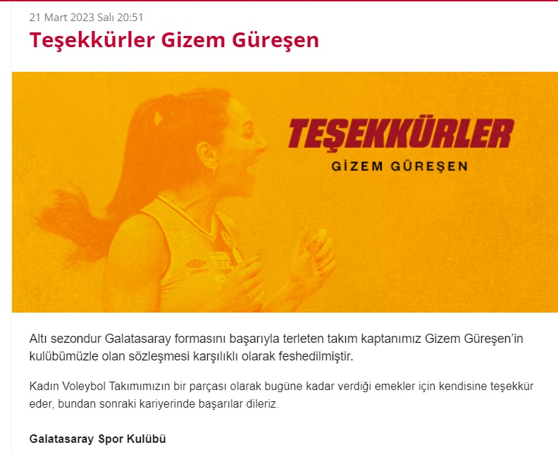misli.com Sultanlar Ligi takımlarından Galatasaray HDI Sigorta, son altı sezondur sarı kırmızılı formayı giyen Milli Voleybolcu Gizem Güreşen' ile karşılıklı anlaşarak yollarını ayırdı.