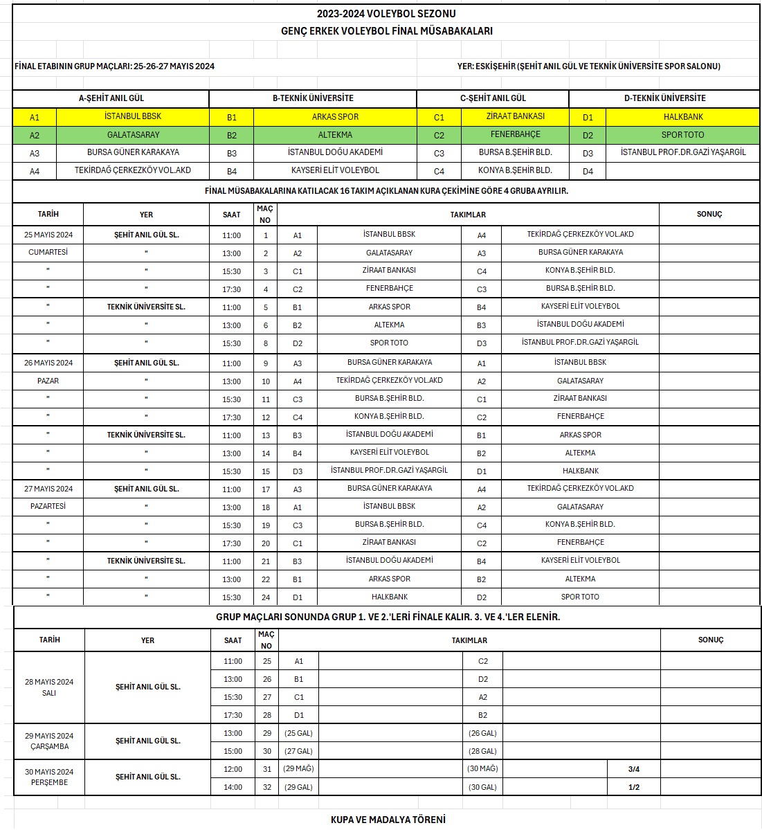 Genç Erkekler Türkiye Şampiyonası Finalleri 25 Mayıs Cumartesi günü Eskişehir'de oynanacak karşılaşmalarla başlıyor. Turnuva öncesi teknik toplantı TVF Eskişehir Voleybol İl Temsilcisi Cihat Fırıncıoğlu başkanlığında gerçekleştirildi. Teknik toplantıda kural ve talimatlar anlatıldı ve fikstür kurası çekildi. Final müsabakalarının programı şöyle: