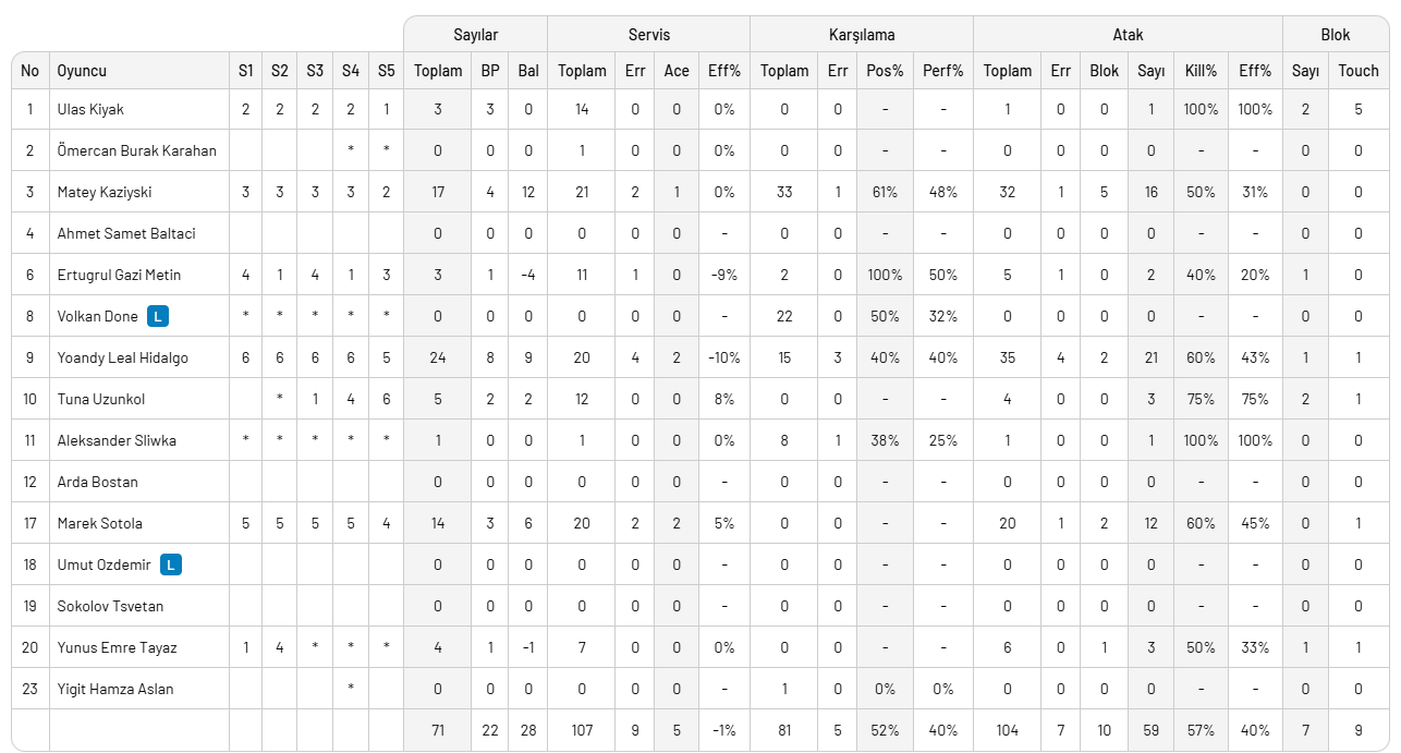 Halkbank'a 2 puana 7 blok, 59 hücum, 5 servis sayısı ile direkt rakip hatasında aldığı 37 sayı ile ulaşırken, Leal 24, Kaziyski 17, Sotola 14 sayı ile çift haneli sayıları gördüler.