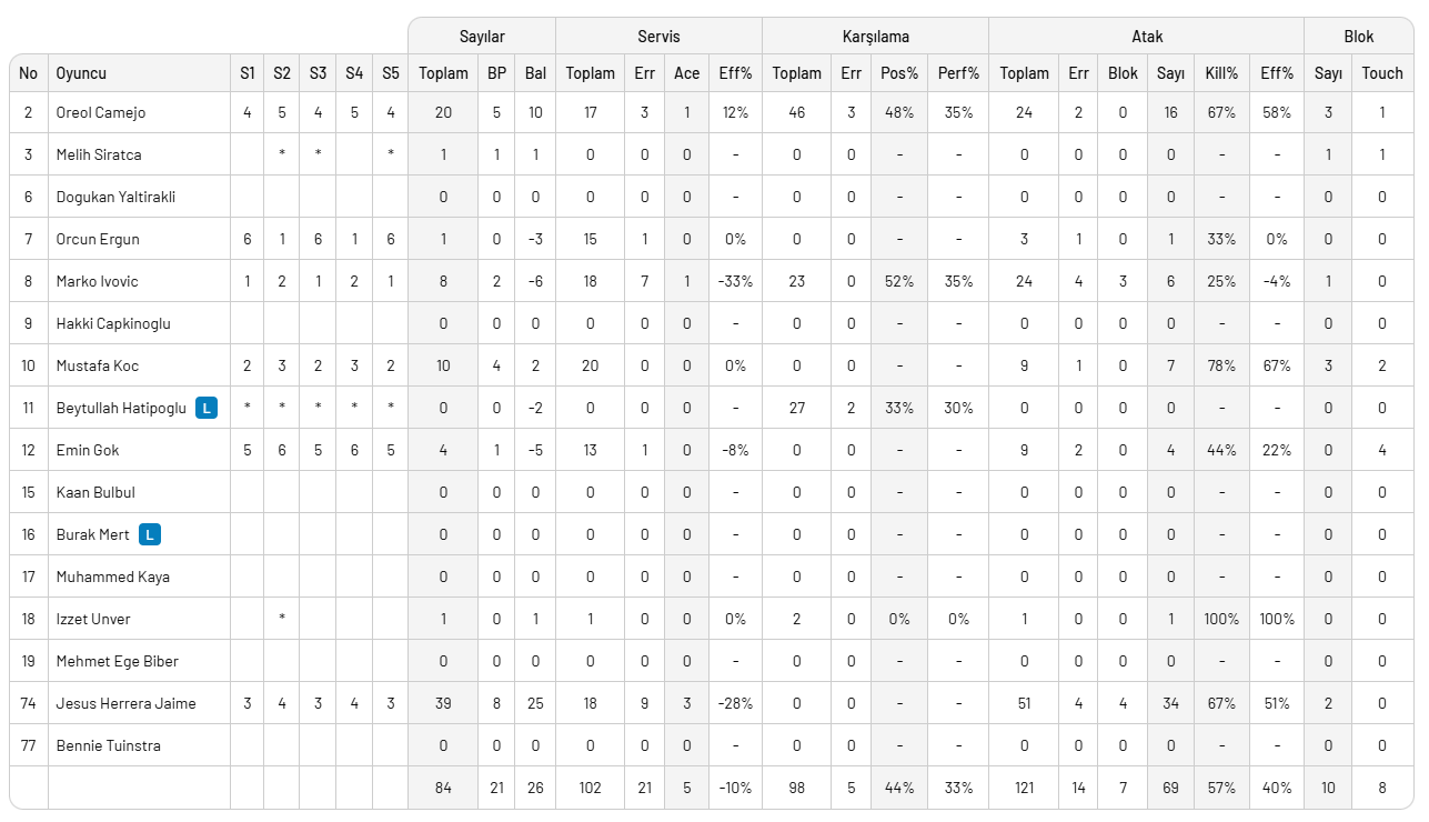 TVF Ziraat Bankkart Voleybol Salonu'nda oynanan karşılaşmanın setleri 25-21, 21-25, 25-22, 18-25, 12-15 sonuçlandı.