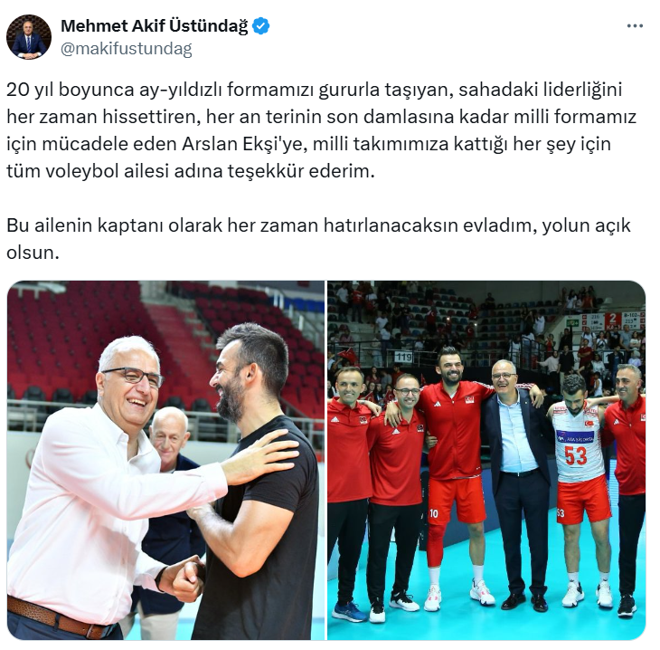 TVF Başkanı Mehmet Akif Üstündağ Milli Takım kariyerini noktaladığını açıklayan Arslan Ekşi'ye duygu yüklü veda mesajı...