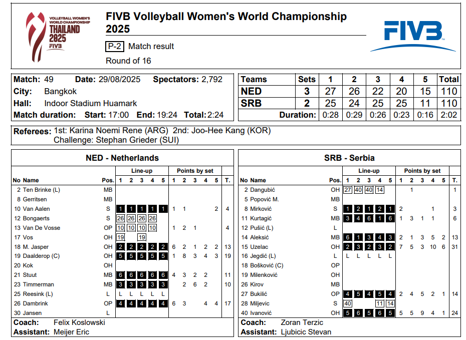Bloklarda Sırbistan 11-10 önde görünürken, servislerde Hollanda fark yarattı. Portakallar 7 ace buldu, Sırbistan ise sadece 3 ace üretebildi. Servis hataları da maçın kırılma noktası oldu: Hollanda yalnızca 3 hata yaparken, Sırbistan 17 hata ile fırsatları kaçırdı.